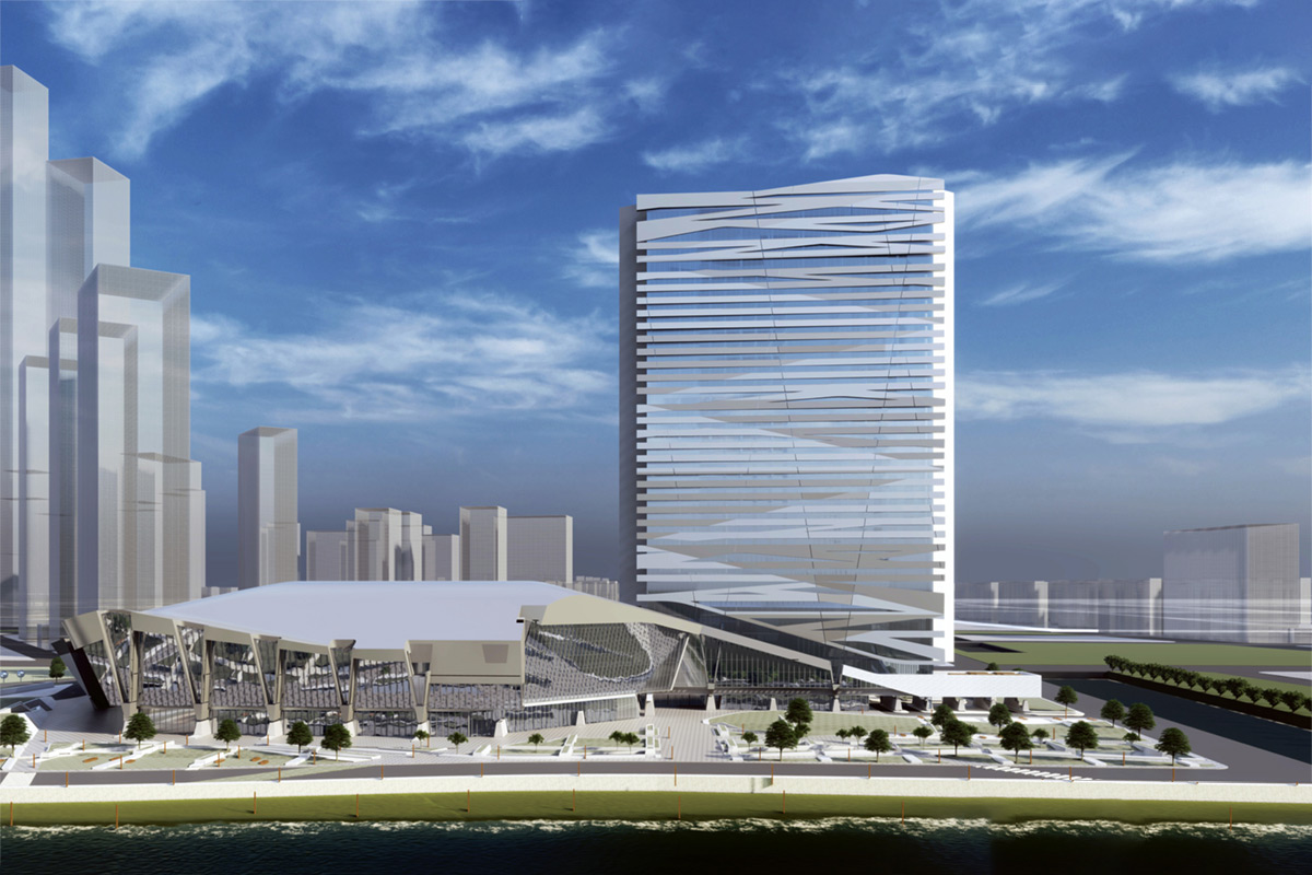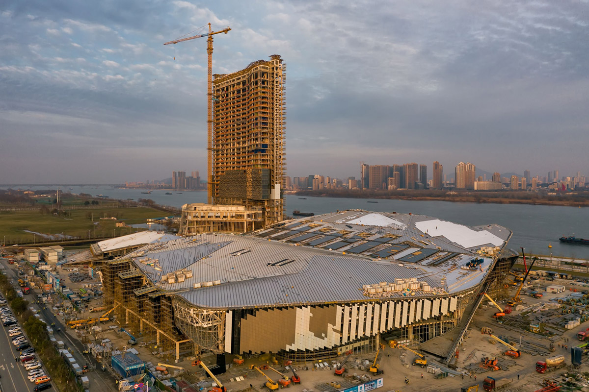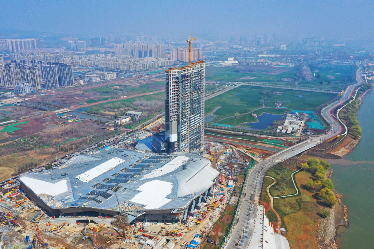南京扬子江国际会议中心工程建筑面积18.73万平方米,主要由会展区、会议区、办公区和酒店区四部分组成,总用钢量为 4.6万吨。本项目承建地下室和酒店区钢结构,酒店区为 “钢框架+钢支撑”结构体系, 总用钢量约1.6万吨,其中酒店区共35层,面积约5.1万?,建筑高度157m, 平面长宽比为6.6、 高宽比为9.6,超限接近极值,如此复杂的结构在 国内屈指可数。